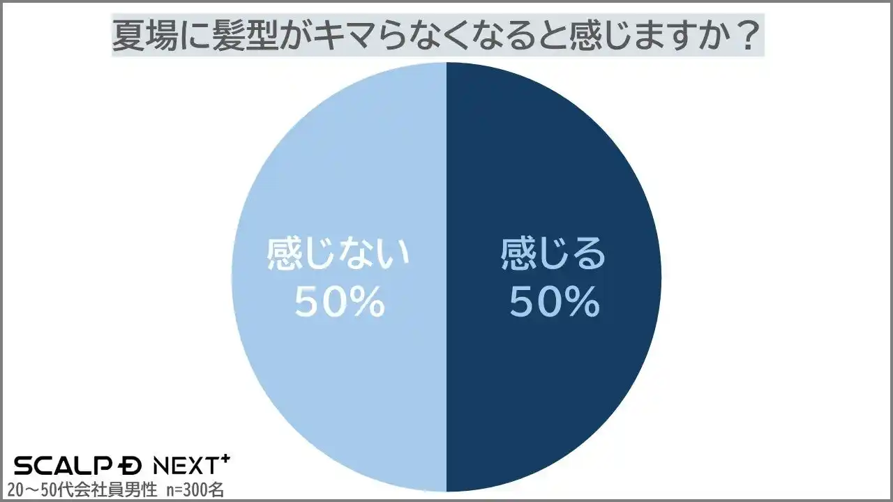 調査の結果、高温多湿な環境で髪型がキマらなくなると「感じる」と回答したビジネスマンは150人(50.0%)で、ちょうど半数の男性が長期間続く猛暑による髪悩みを抱えていることが分かりました。 |