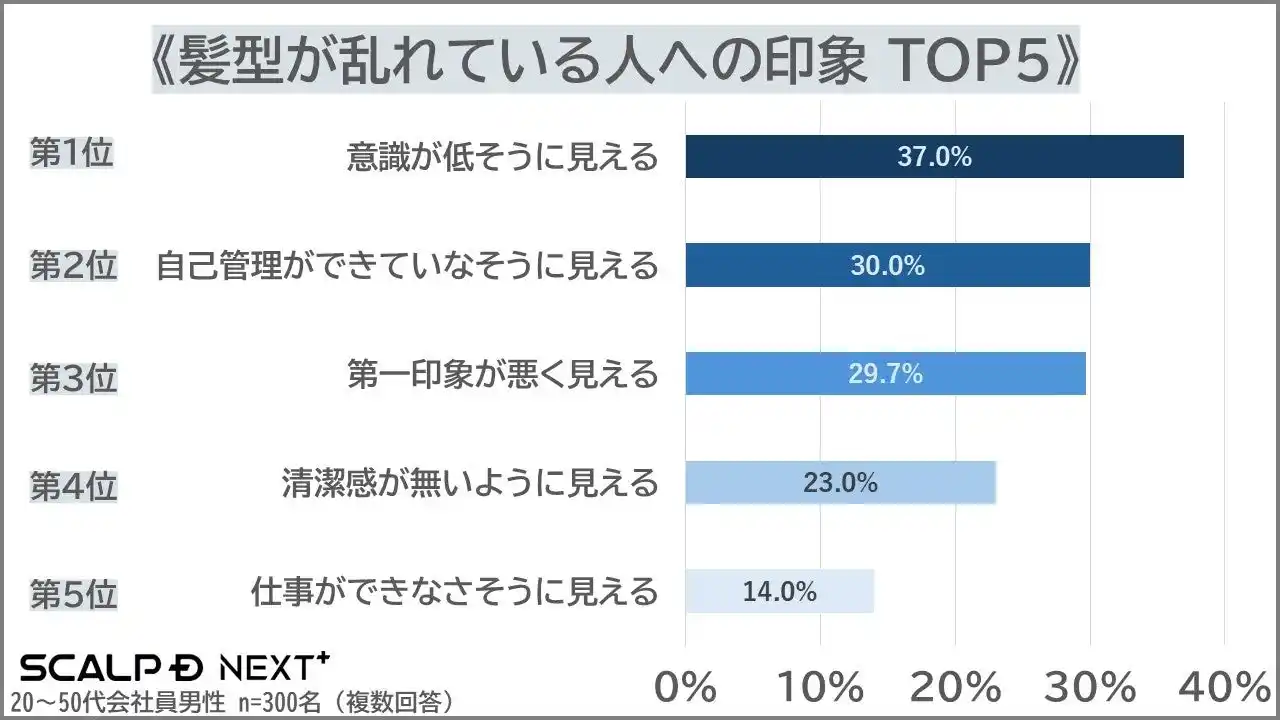 第一印象はビジネスシーンでも極めて重要な要素です。中でも「髪型」は視線が集まりやすく、相手の印象を大きく左右します。そんな中、髪型の乱れがどのような印象を与えるのかを調査した結果、最も多かった回答は「意識が低そうに見える」で37.0%に達しました。続いて「自己管理ができていなそうに見える」(30.0%)、「第一印象が悪く見える」(29.7%)となり、髪型の乱れが仕事への取り組み姿勢そのものを疑われる要因となっていることが判明しました。現代のビジネスシーンでは、髪型が「仕事ができる人」の重要な判断基準の一つとして機能していることが浮き彫りになりました。 |