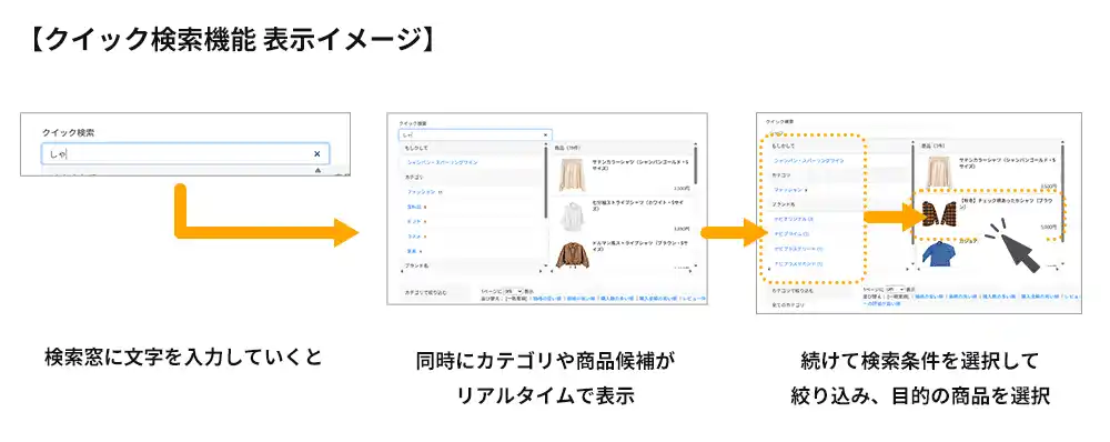 「クイック検索機能」は、入力文字に応じて検索窓にカテゴリ・ブランド・商品名などの候補をリアルタイムで表示し、候補をクリックすると画面遷移なしで検索結果をその場で即時表示できる新機能です。複数カテゴリをまたぐ商品検索でもページ切り替えが不要なため、一覧ページと商品詳細ページを行き来する必要がなく、ユーザーは目的の商品に直感的かつスピーディにアクセスできます。これにより、途中離脱の抑制やCVR・回遊率の向上につながり、さらに「NaviPlusサーチ」の既存機能と組み合わせることで、検索を起点とした効果的な導線設計や接客体験の構築が可能となります。 |