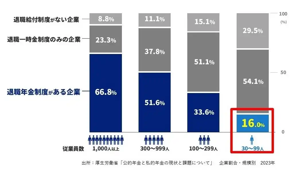 日本の全企業数のうち、中小企業数は99.7%、中小企業で働く従業員数は69.7%*²と非常に多いなか、従業員規模30~99人の企業で退職年金制度がある企業はわずか16%*³にとどまっています。 「はぐくみ企業年金」をご利用いただくことで、より多くの中小企業とそこで働く方々が企業年金制度の恩恵を受けられるよう、さらなる普及拡大を目指します。 |