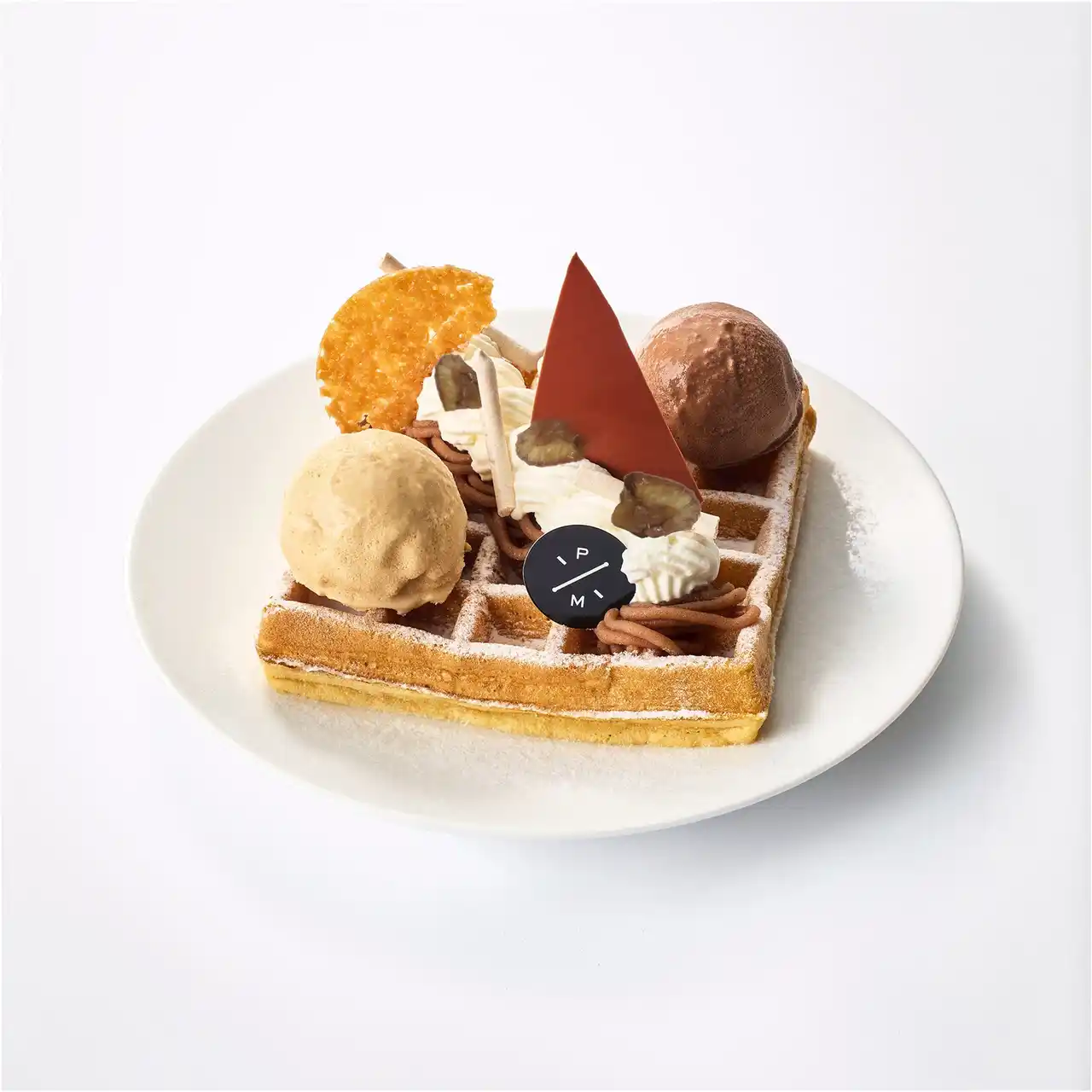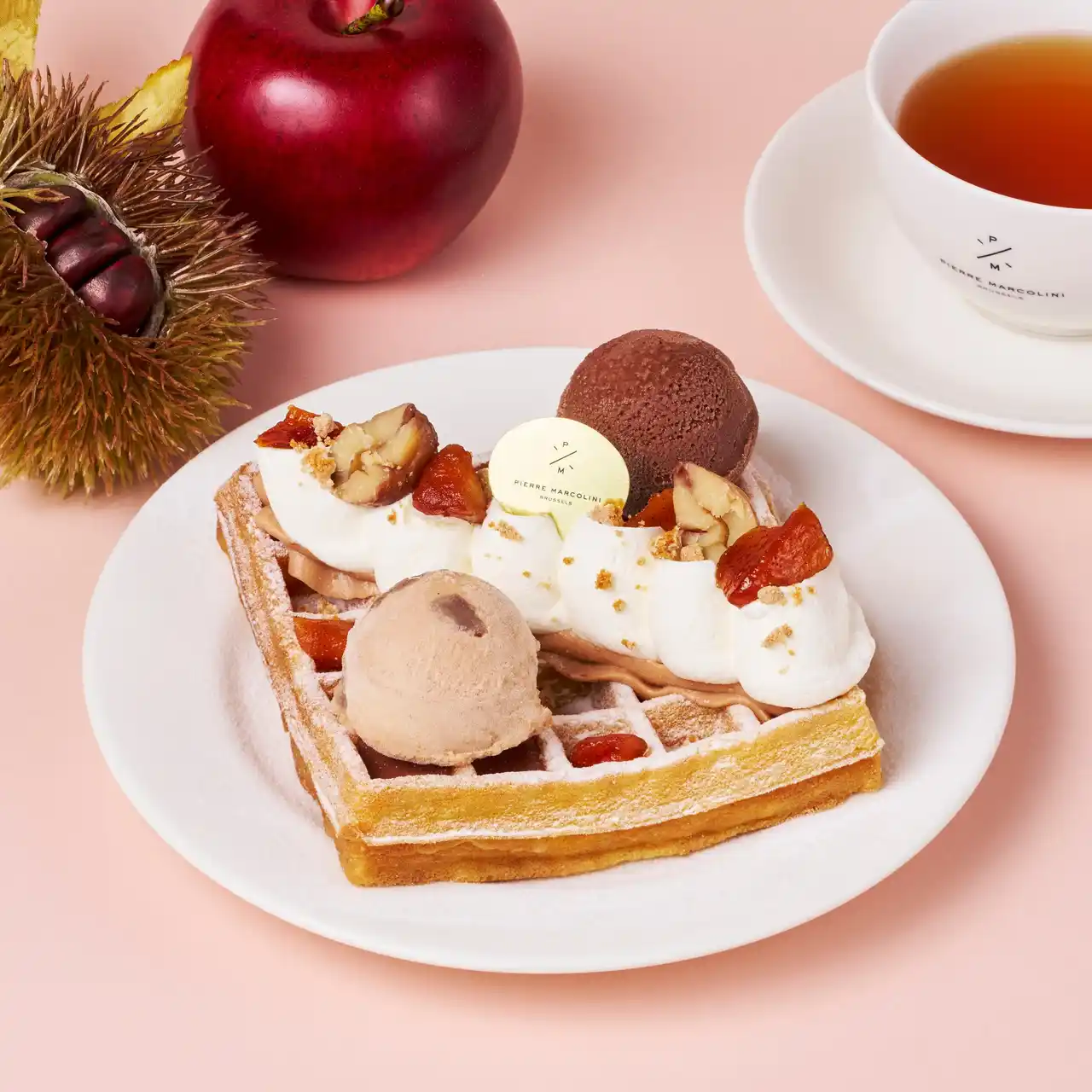 焼きたてのもっちりワッフルに、シルキーなキャラメルアイスとチョコレートアイス、 上質なラム酒で香りづけしたマロンクリームとマロンエトフェをトッピングしました。 季節の風味をお楽しみください。 |