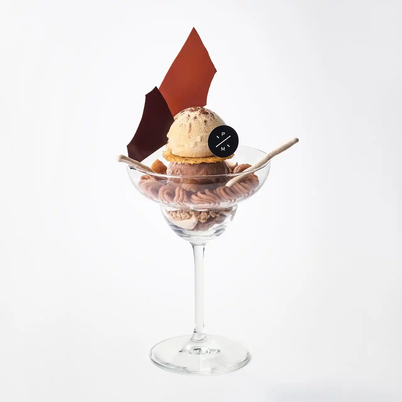 シルキーなキャラメルアイスとチョコレートアイスに上質なラム酒で香りづけしたマロンクリームとブランマンジェ。スペキュロスとマロンエトフェ、メレンゲが絶妙な歯応え。季節の風味をお楽しみください。 |