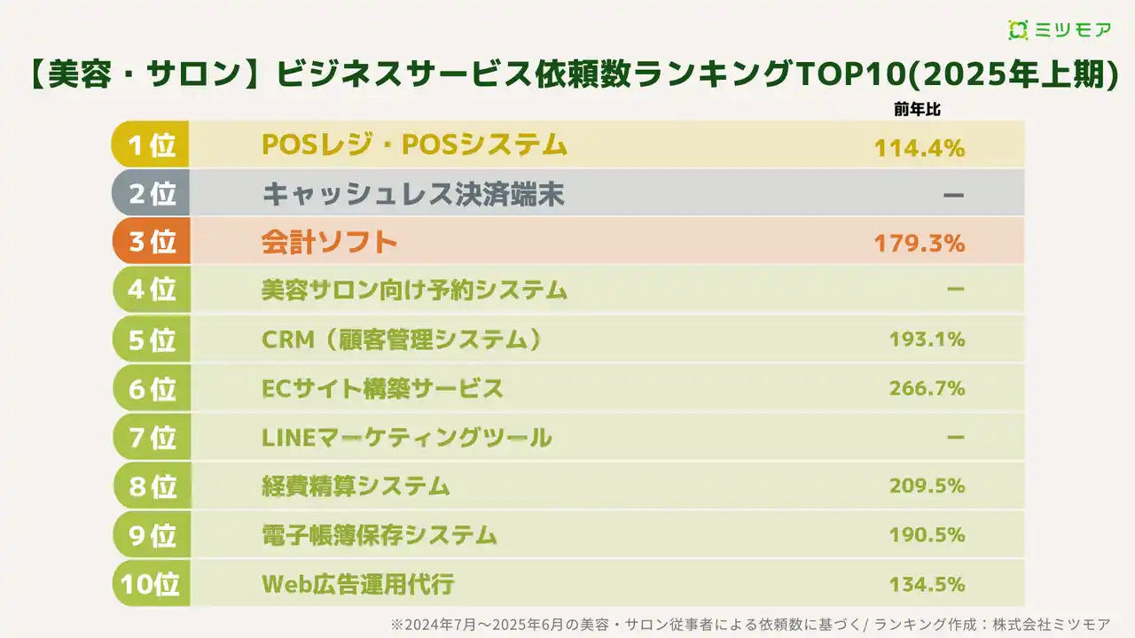 また、POSレジ・POSシステムとキャッシュレス決済端末が依然として需要の上位を占めていることから、会計業務の効率化とデータに基づいた経営分析への関心も高いことがうかがえます。特に会計ソフトは、前年比率の全業種平均(94.5%)を大きく上回る179.3%という高い伸びを示しており、顧客接点のデジタル化と並行して、経営基盤の強化も急務となっていることがわかります。これらのツールを連携させることで、予約から決済、顧客管理、再来店促進までを一気通貫で管理する「デジタル経営」への移行が進んでいると言えそうです。 |