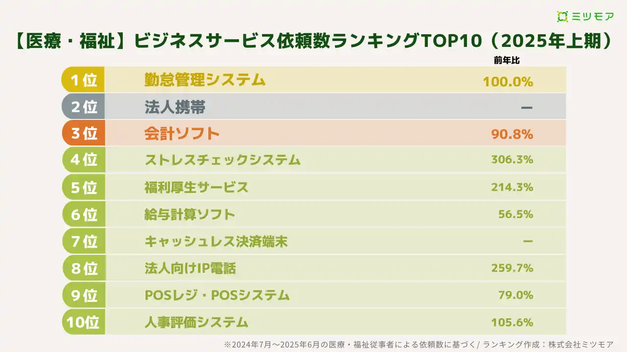 医療・福祉業界の特性を最もよく表しているのが、従業員のウェルビーイングに関連するサービスの急成長です。ストレスチェックシステムは前年比306.3%、福利厚生サービスは214.3%と、他業界と比較しても際立って高い伸び率を記録しています。これは、職員のメンタルヘルスケアや労働環境の改善が離職を防ぎ、ひいては提供するケアの質を維持するための死活問題であるという経営層の強い危機感の表れとも見て取れます。 |