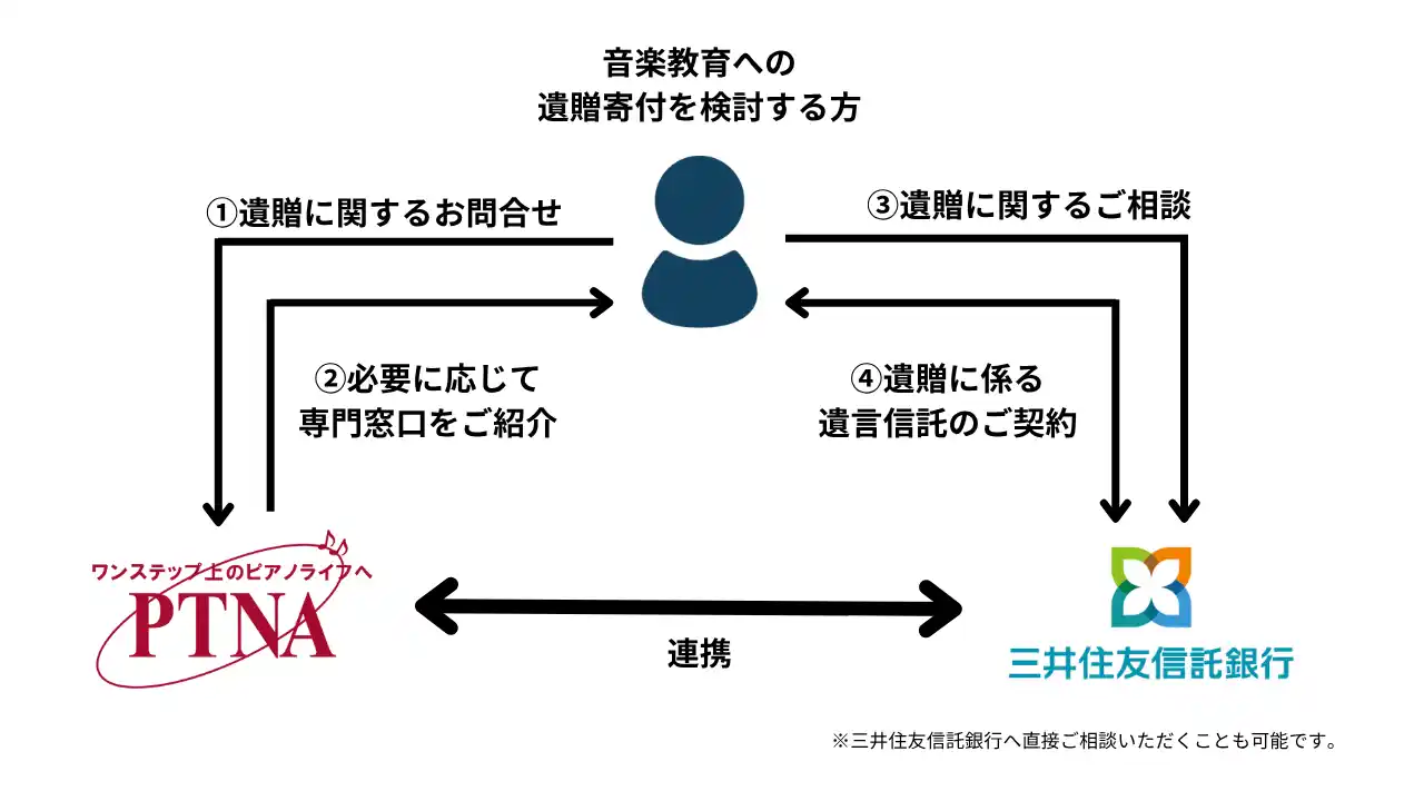 今後、遺贈寄付を検討する方がピティナにご相談いただいた際には、内容に応じて三井住友信託銀行の専門窓口にお繋ぎし、より安心して遺言書に寄付の意志を遺していただくことができるようになります。 |