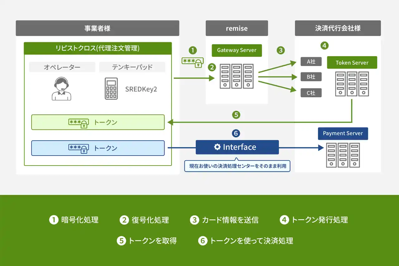 今回の連携により、リピストクロスの「代理注文管理」とルミーズのコールセンター向けMOTOソリューションを組み合わせることで、コールセンター業務でも安全にカード決済が行えます。電話で受け付けたカード情報はテンキーパッド「SREDKey2」で入力し、カード情報の処理・伝送・保管はすべてルミーズが担うため、事業者はセキュリティリスクを気にせず、これまでのワークフローを大きく変えることなく導入が可能です。 |