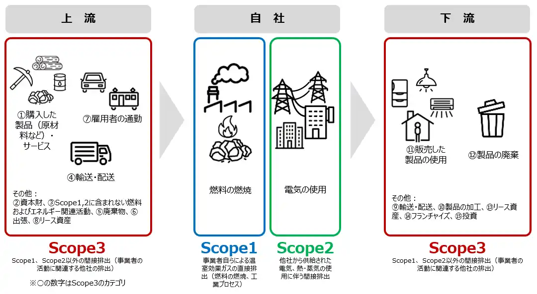 出典:知っておきたいサステナビリティの基礎用語~サプライチェーンの排出量のものさし「スコープ1・2・3」とは|資源エネルギー庁 |