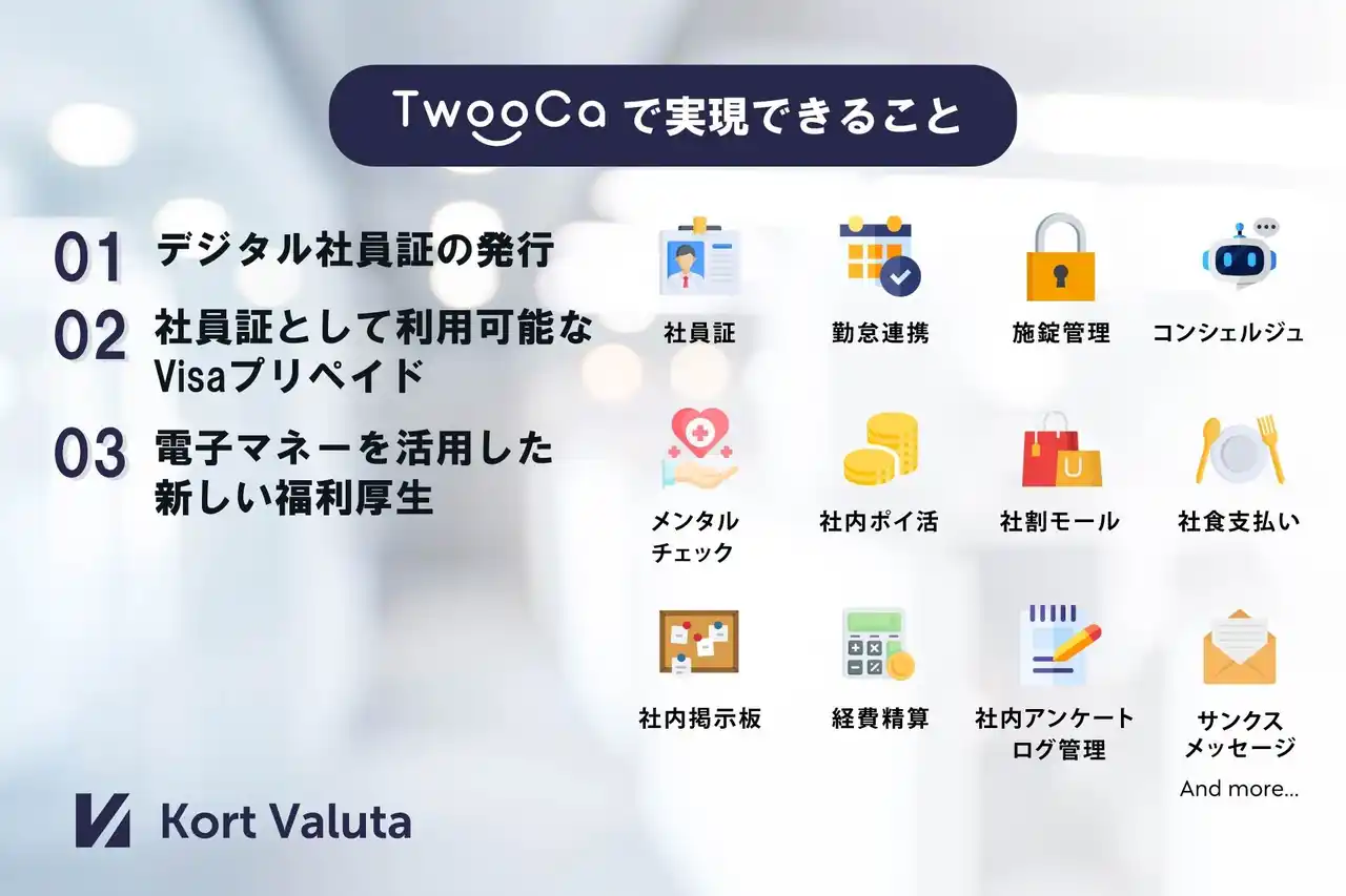 TwooCaとは、当社が提供するサービスの総称で、主なサービスとしては、Visa決済機能付き社員証を備えたTwooCaアプリで提供される以下のサービスがあります。 |