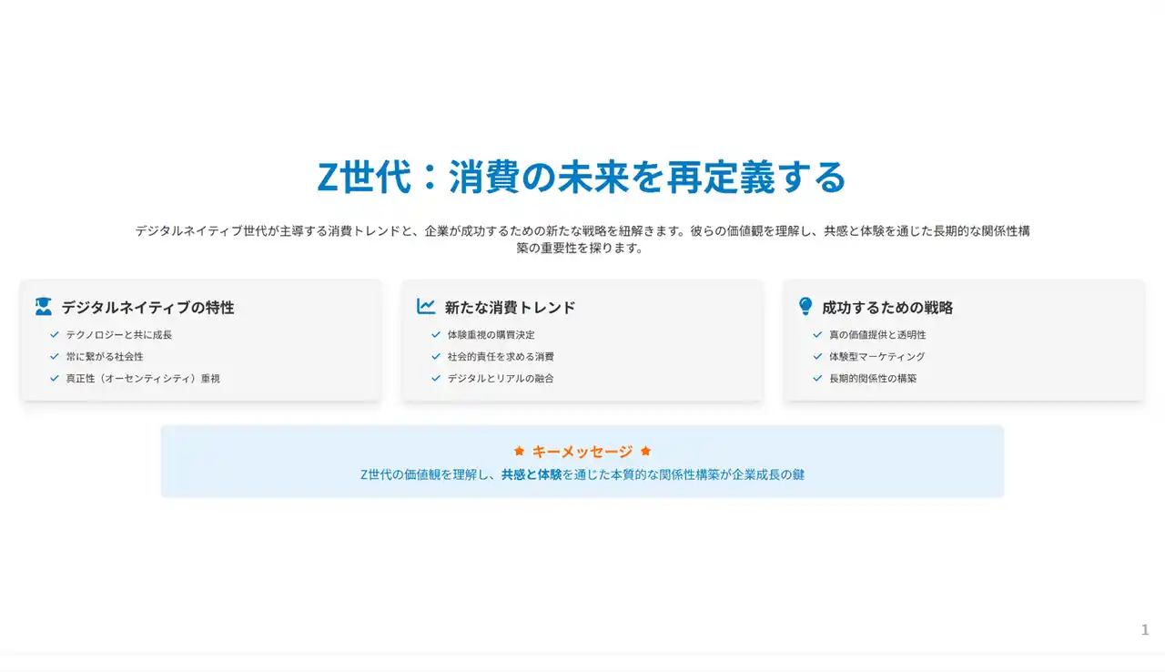 簡単な指示で資料構成からデザインまで数分で10枚以上のスライド生成が可能 |