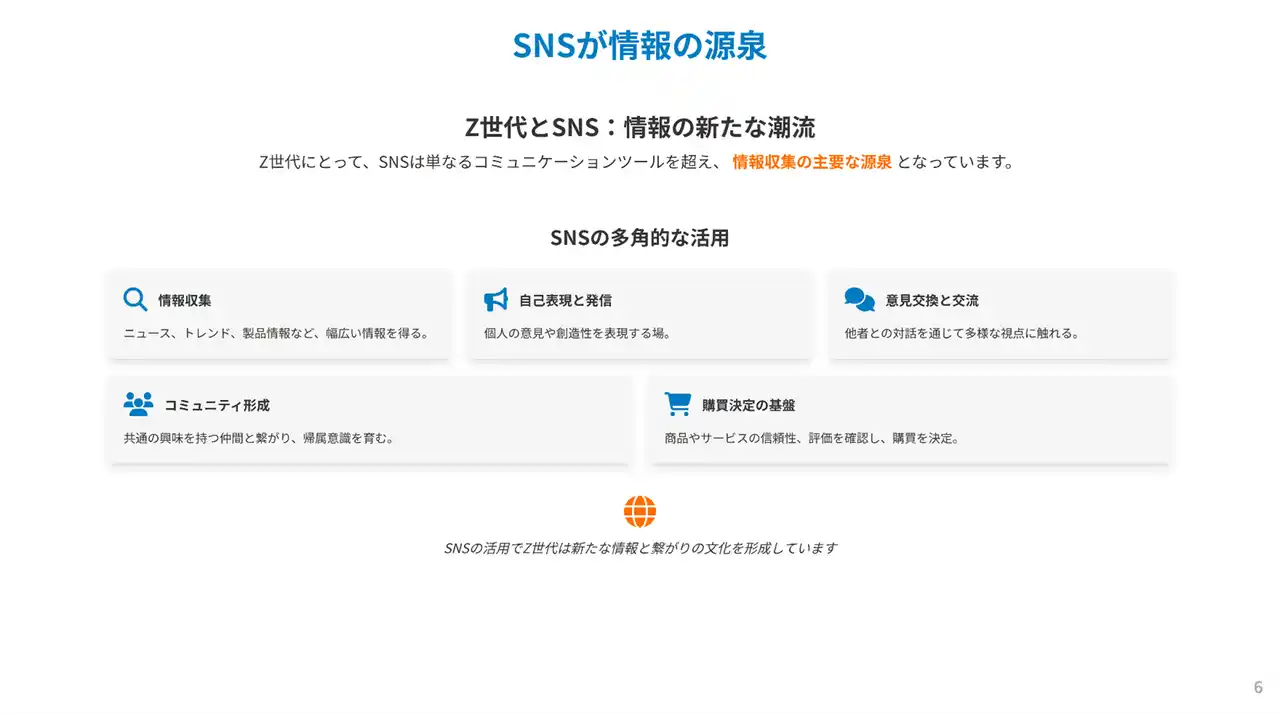 調査・企画内容を基に、目的に応じたデザイン性の高い提案/企画資料を自動生成 |