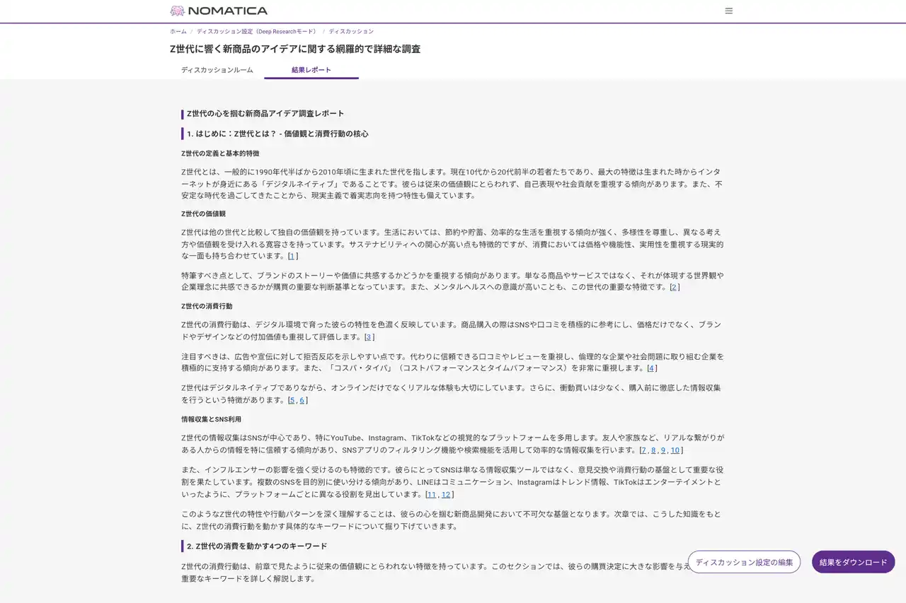 大量のWEB情報を自動で収集・分析し、出典付きの調査レポートを生成 |