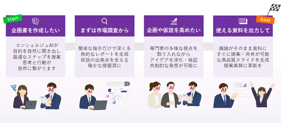 今回の進化により、Nomaticaは企画立案にとどまらず、調査・戦略立案・資料化まで企画業務の全フローを一気通貫で支援するプラットフォームへと拡張しました。これにより、ユーザーは、添付画像のようなシームレスな顧客体験を手に入れることができます。 |