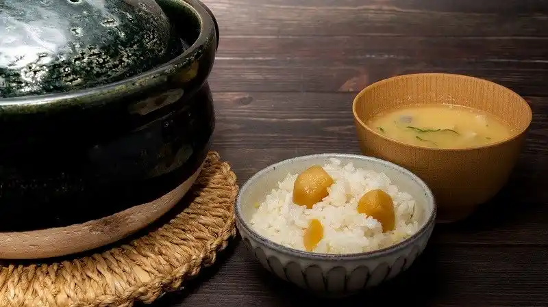 | お釜で炊き上げる栗ごはん、きのこと豆乳の味噌仕立て、お漬物 | |||||||||