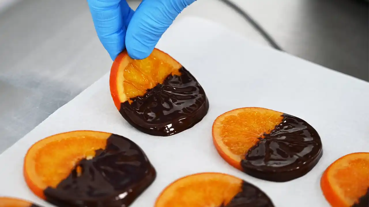 水をほとんど加えず、果汁で炊き上げることで、香りと旨みを凝縮。果肉の粒立ちや果皮の香り、自然な酸味を極限まで保っています。芯まで均一に糖が入ることで、ジューシーな果実とチョコレートの一体感が楽しめる、オランジェットが完成します。 |