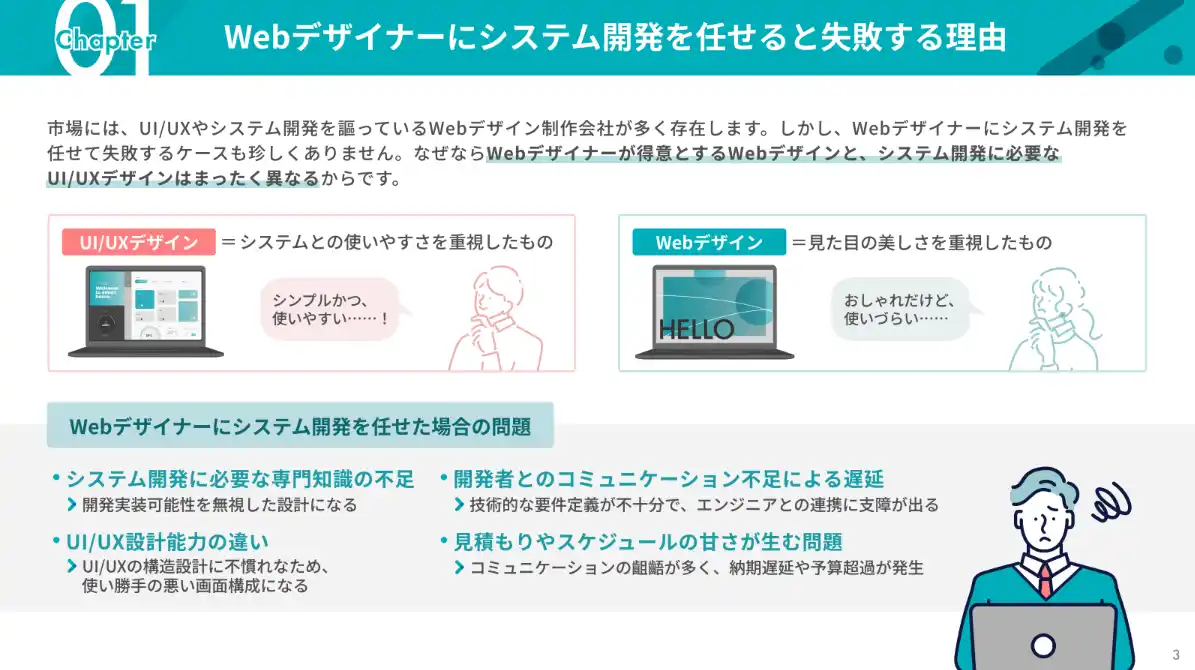 根本的な原因は「役割の誤解」と「コミュニケーション不足」。 システム開発では、UI/UX設計に精通した専門家へ依頼することが不可欠です。 |
