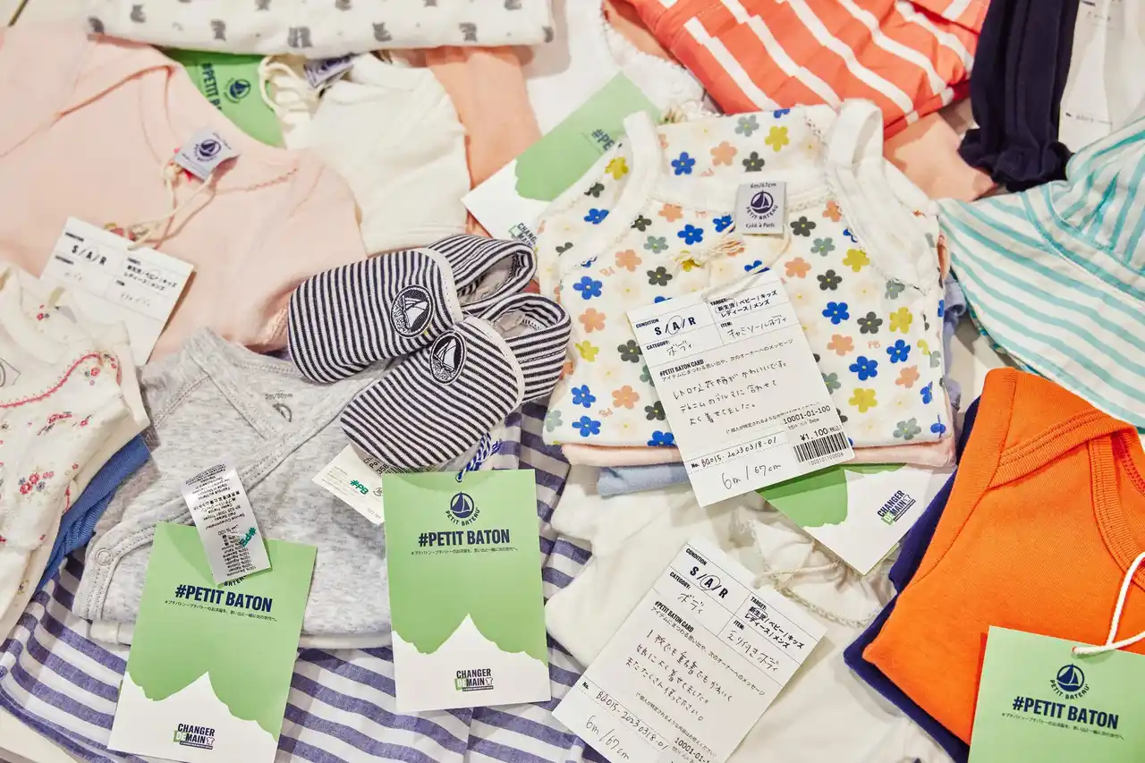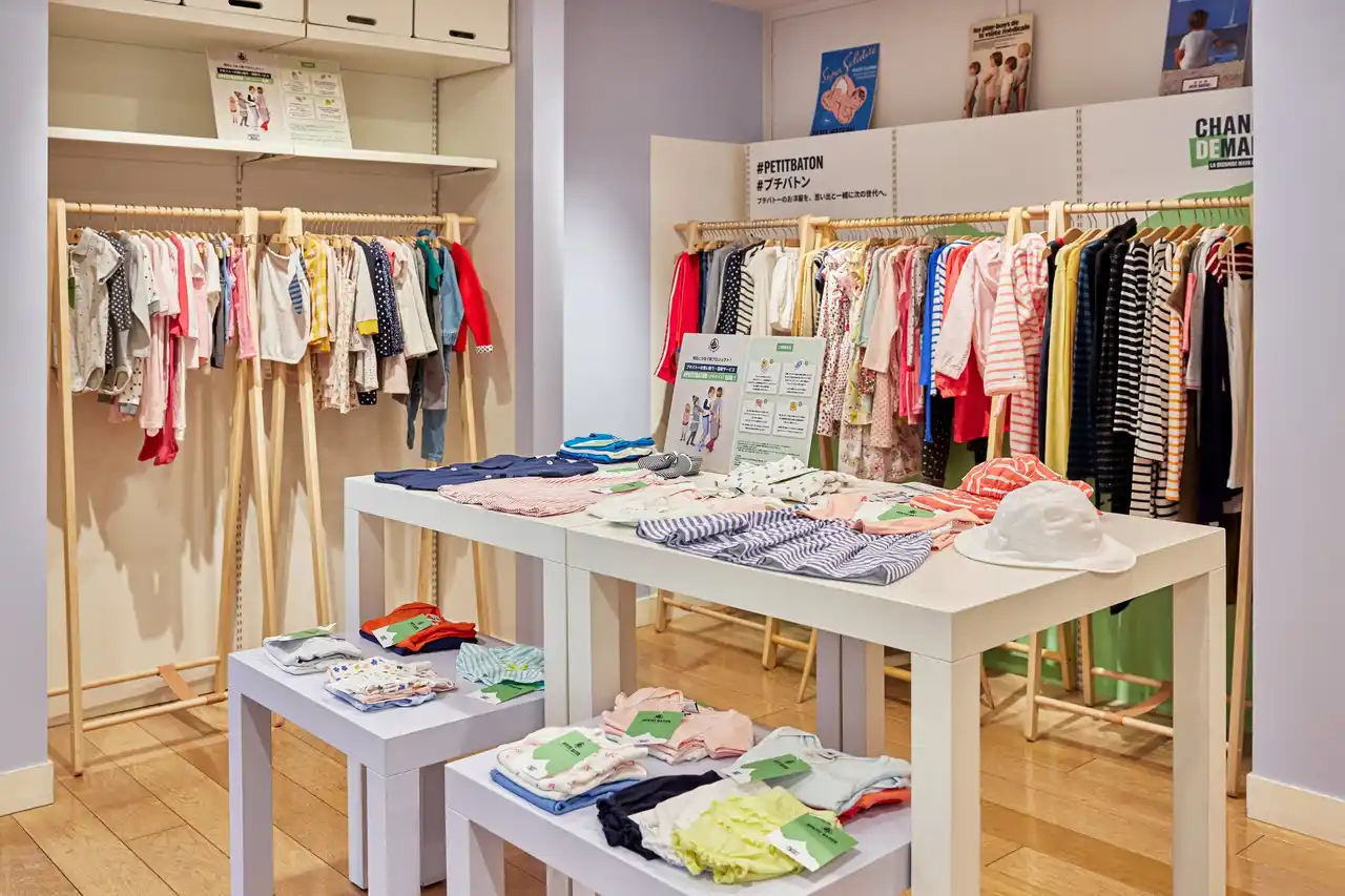 「#プチバトン」は、お客様から着なくなったプチバトーのお洋服を思い出と一緒にお預かりし、次のオーナーへとつなぐ、サステナブルな取り組みです。ブランドを愛用するお客さまと一緒に、持続可能な未来を描いていく活動の一環として展開しています。現在12店舗で回収を行い、再販可能なお洋服はプチバトーブティック 吉祥寺店にて販売しています。 |
