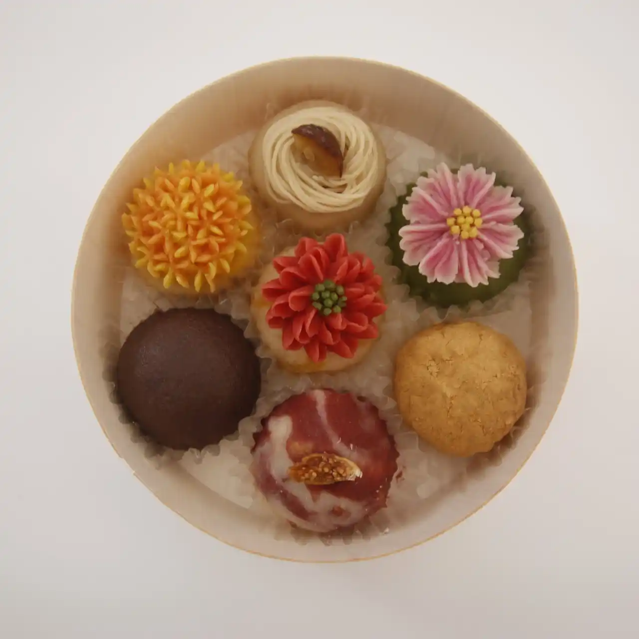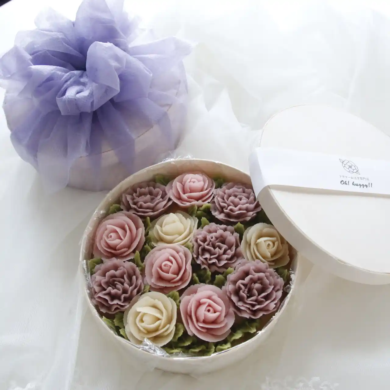 白こし餡を天然色素で美しく色づけし、ひとつひとつ丁寧に花の形に絞り仕上げ、可愛い風呂敷でラッピングしてご用意いたしますので、大切な方への感謝の気持ちを込めた特別なギフトにぴったり。予約販売にてご用意しており、常温でのお持ち帰りはもちろん、全国への冷凍配送も承っております。 |