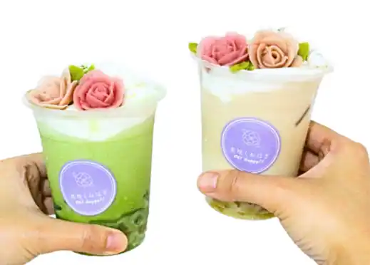 「花咲くわらび餅ドリンク」は、抹茶ラテやほうじ茶ラテにわらび餅を加え、ホイップクリームと餡フラワーで華やかに仕上げた贅沢な一杯。 |