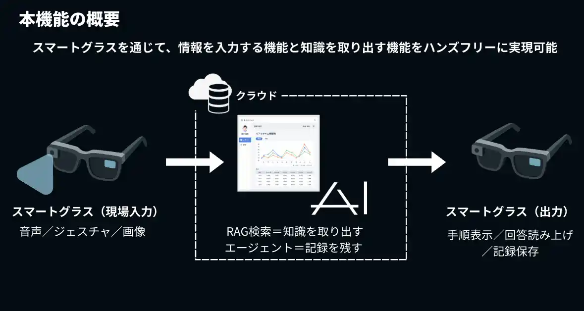 本機能は、「RAGによる情報検索・要約=知識を取り出す機能」と「エージェントによる自動実行・記録=情報を入力する機能」の両面を、スマートグラスを通じてハンズフリーで実現できる点が長所です。 |