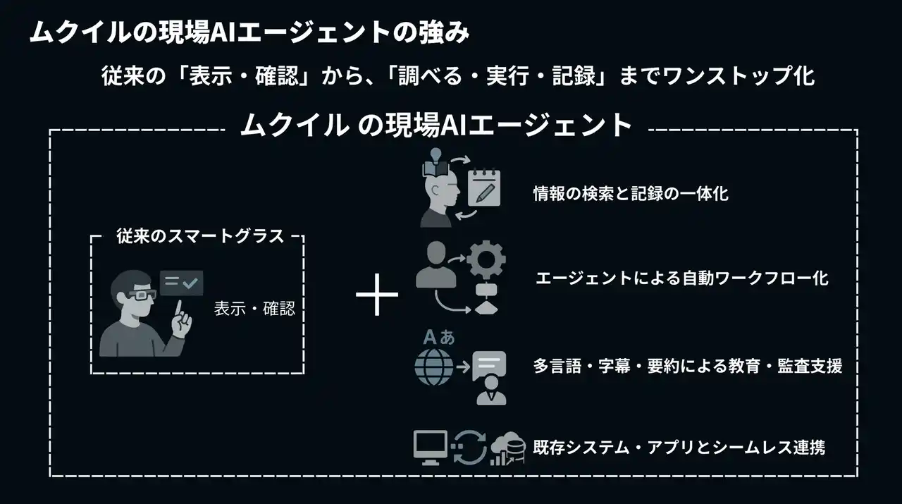 既存のスマートグラスは「表示・確認」に偏っていましたが、ムクイルの『現場AIエージェント』を組み合わせることで、「調べる・実行する・記録する」をワンストップで自動化できる革新的なデバイスに進化します。これにより、「情報を探す」と「記録を残す」をつなげることで、現場の知識が自然にたまっていき、作業の標準化も可能になります。 |