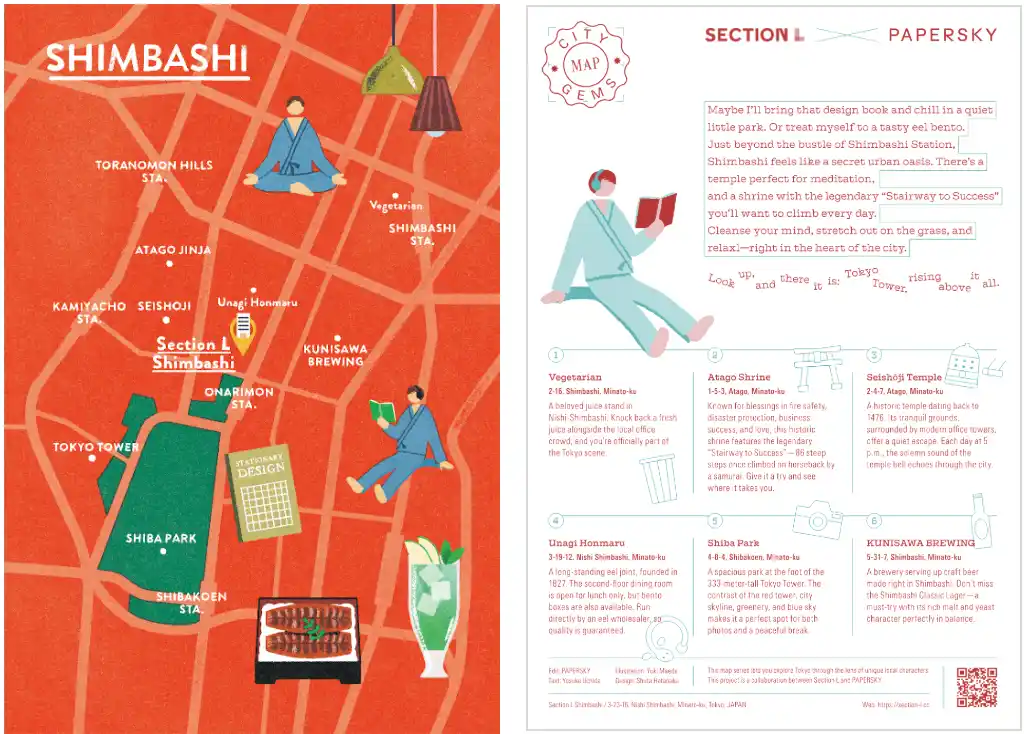 「One-Day Map」とは、Section Lの宿泊者向けに配布するローカルマップです。今回、第1弾としてまずは蔵前と新橋から開始します。 |