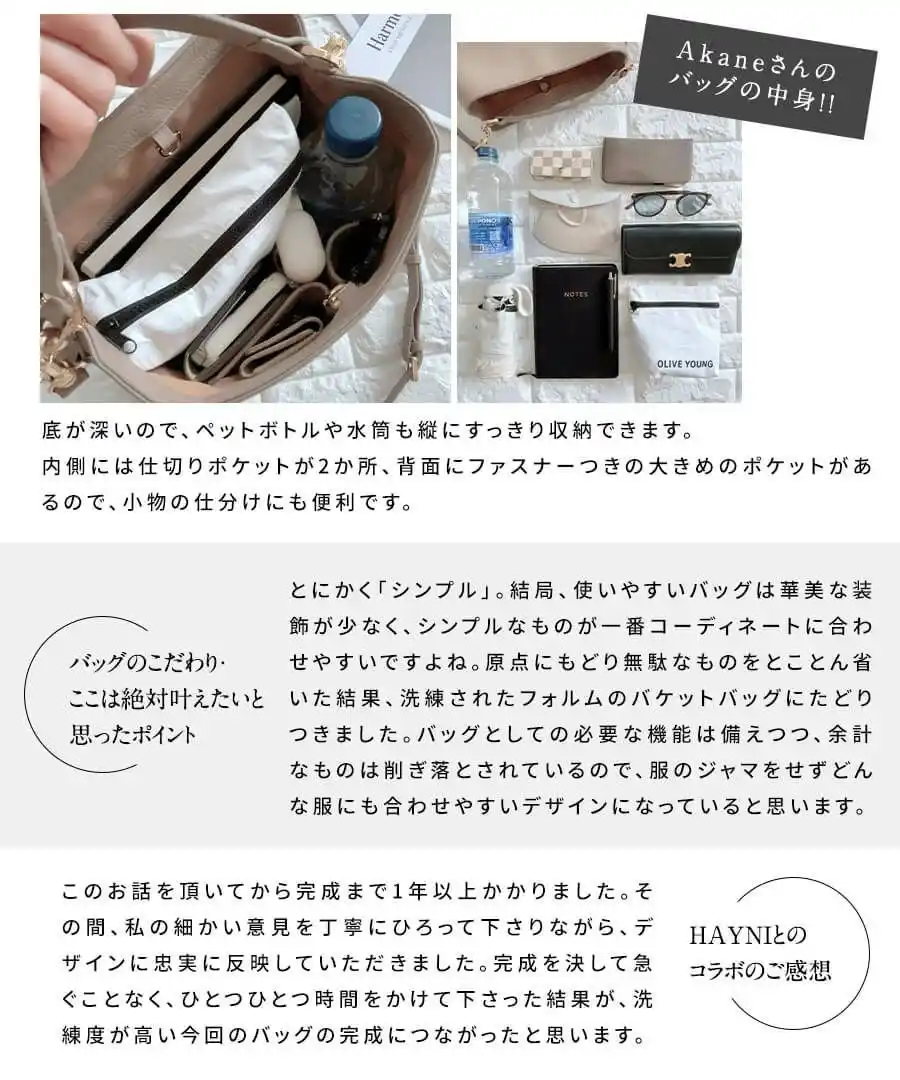 HAYNI(ヘイニ)は、2015年にマンションの一室からスタートした大人の女性のためのバッグブランドです。創業者の上間亜希子は、当時2歳の一人娘を抱えシングルマザーになったタイミングでブランドを立ち上げました。仕事と子育てを両立する生活の中で感じた、多くの女性が抱える課題を解決するため、「どうすれば、この状況を華麗にこなすことが可能か?」をミッションに掲げています。 |