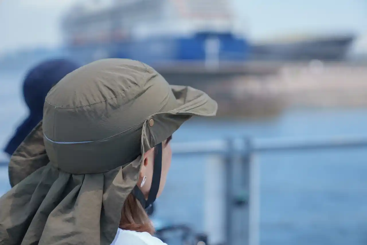 ・風で帽子がバタつかないよう、形状記憶ワイヤーを内蔵し快適なフィット感と広い視野が続きます。 |
