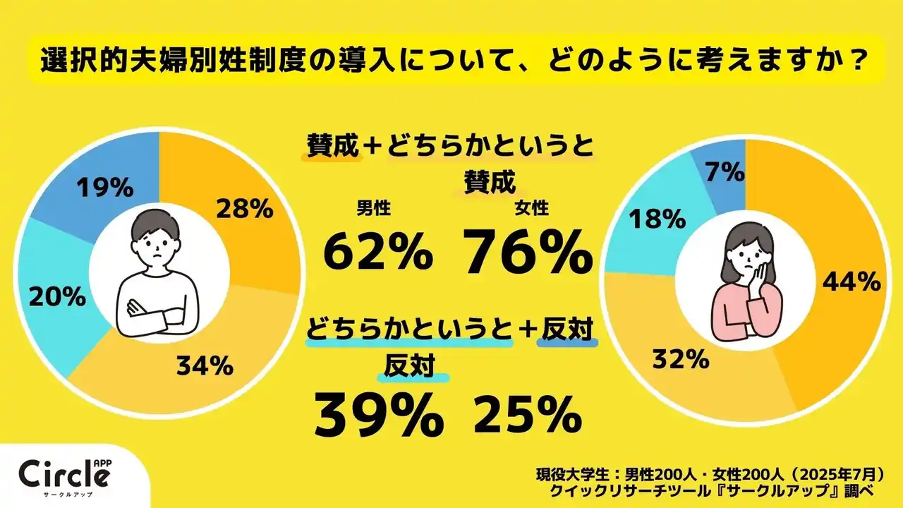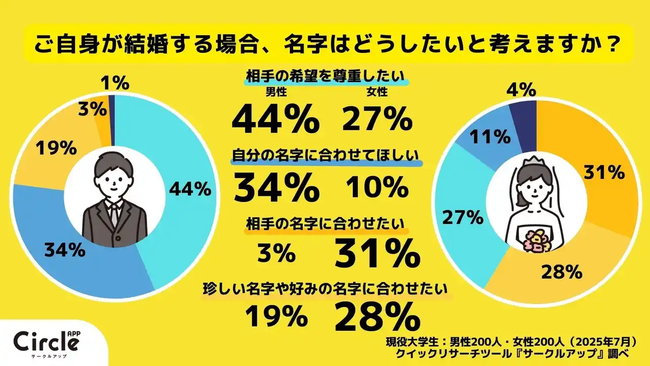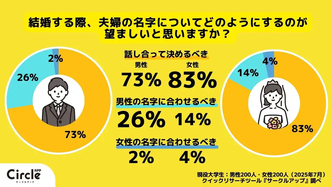 株式会社RECCOO(本社:東京都渋谷区、代表取締役:出谷 昌裕、以下、当社)が運営するZ世代に特化したクイックリサーチサービス『サークルアップ』は、最新のZ世代調査として「名字」に関する調査レポートを発表します。今回の調査では、現役大学生の自分の名字に対する感情、結婚後の名字の希望、そして選択的夫婦別姓制度への考えについて男女別で調査しました。なお、サークルアップを活用してZ世代の調査を行いたい場合、または調査結果を自社メディアの記事などに転載される場合は、こちらにお問い合わせください。 |