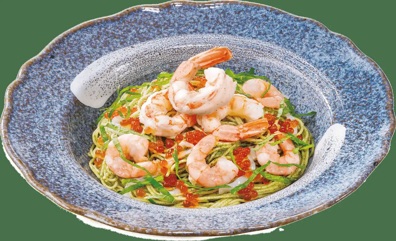 鮮やかなグリーンが目をひく大葉ジェノベーゼのパスタに、ぷりぷりの尾付き赤エビとむきエビ、ぷちぷちと弾けるいくら、細切りのイカをあわせた具沢山なパスタです。フレッシュな大葉を散らしているため、より大葉の風味をお楽しみいただけます。ほど良い塩味でさっぱりとした味わいのジェノベーゼソースは、ひんやり冷たいカッペリーニと相性抜群。最後の一口まで爽やかにお召し上がりいただけます。 |