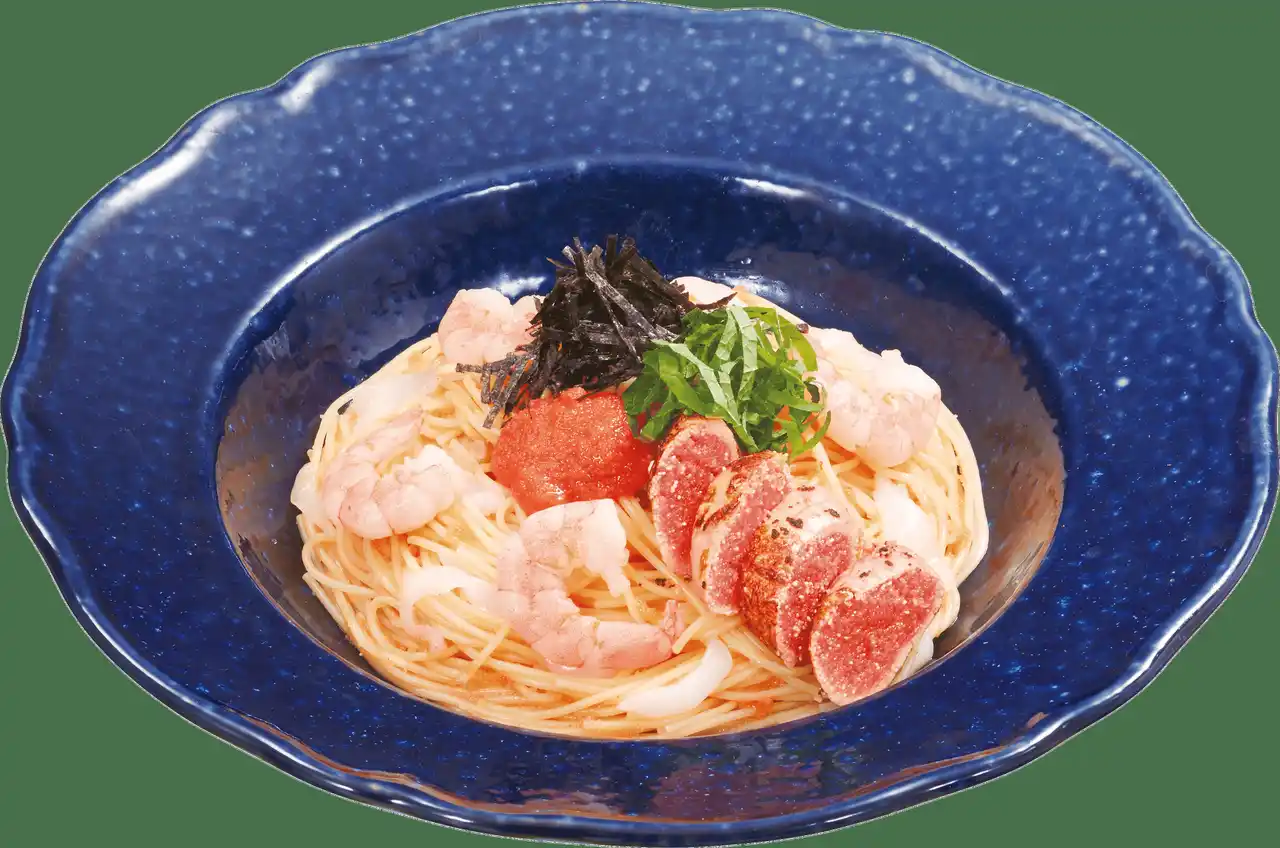 また、販売開始以来ご好評をいただいている、「“冷製カッペリーニ” 炙り明太子とヤリイカ・エビの明太子ソース」は引き続き、お楽しみいただけます。 |