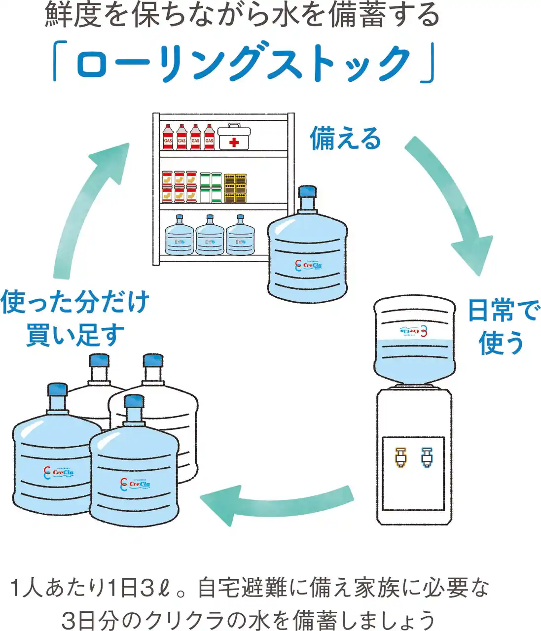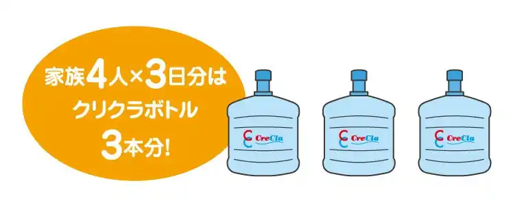 宅配水の「クリクラ」は、安心・安全なおいしいお水をご家庭やオフィスに直接お届けしています。クリクラボトル(1本12リットル)を普段から常に3本備蓄しておくことで、4人家族が3日間過ごせる分の水を自宅に確保することができるので、ローリングストックにもおすすめです。自社開発のウォーターサーバーは停電時でも常温水が出るため、災害時の使用にも適しています。 |