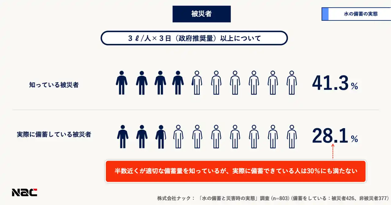 水が最も必要な備蓄品と認識されている一方で、被災者の約42%が適切な備蓄量を理解していながら、実際に推奨量を備蓄できているのは30%未満にとどまりました。 |