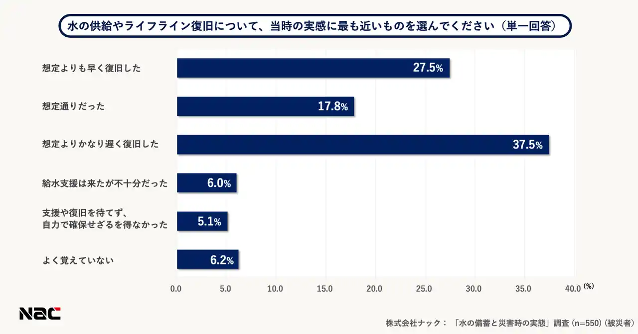 被災者の37.5%が「水やライフラインの復旧は想定よりかなり遅れた」と回答し、「想定より早かった」(27.5%)を10ポイント上回りました。多くの人が、想定以上に長引く断水や停電などライフライン途絶を経験している実態が明らかになりました。 |