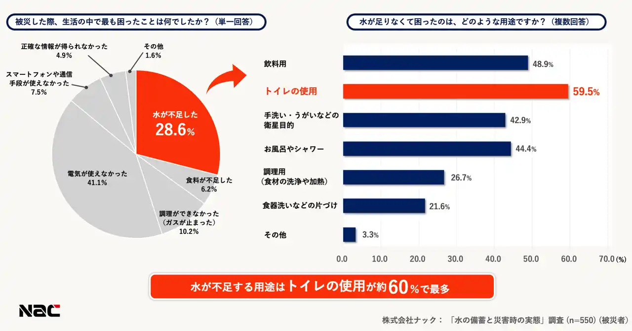さらに災害時には、水や電気といったライフラインの復旧が想定より遅れるケースが多く、特に約60%以上の被災者が「困った」と答えた「トイレ用水の不足」が最も深刻な課題として浮き彫りになりました。 |