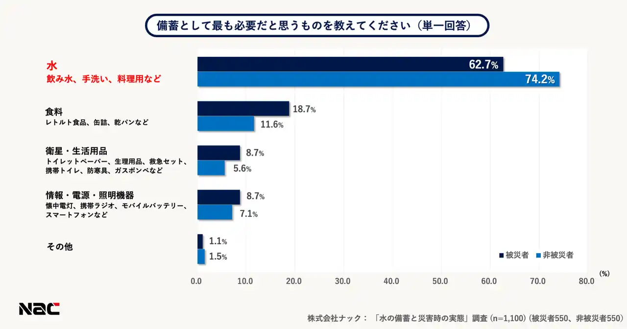 被災者の62.7%が「最も優先して備えるべきものは水」と回答しました。飲用はもちろん、生活・衛生・医療に欠かせないことから、防災意識の中でも水が最も重要視されていることが明らかになりました。非被災者でも74.2%が「水」と回答しており、被災経験の有無を問わず水の備蓄を必要不可欠と認識していることが確認されました。 |