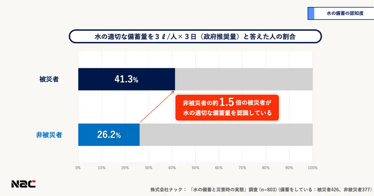 その結果、水の適切な備蓄量を把握している被災者は非被災者に比べて約1.5倍いた一方、実際に推奨量を備蓄できているのは3割未満であり、備蓄の意識と行動のギャップが浮き彫りになりました。 |