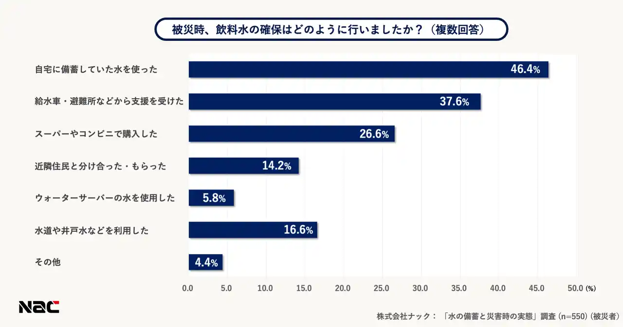 株式会社ナック(本社:東京都新宿区、代表取締役社長:吉村 寛)は、当社が展開する安心・安全なおいしい宅配水「クリクラ」(クリクラビジネスカンパニー代表:川上 裕也)において、9月1日の「防災の日」に向けて、全国の被災者550名・非被災者550名、合計1,100名を対象に「水の備蓄と災害時の実態」調査を実施しました。 |