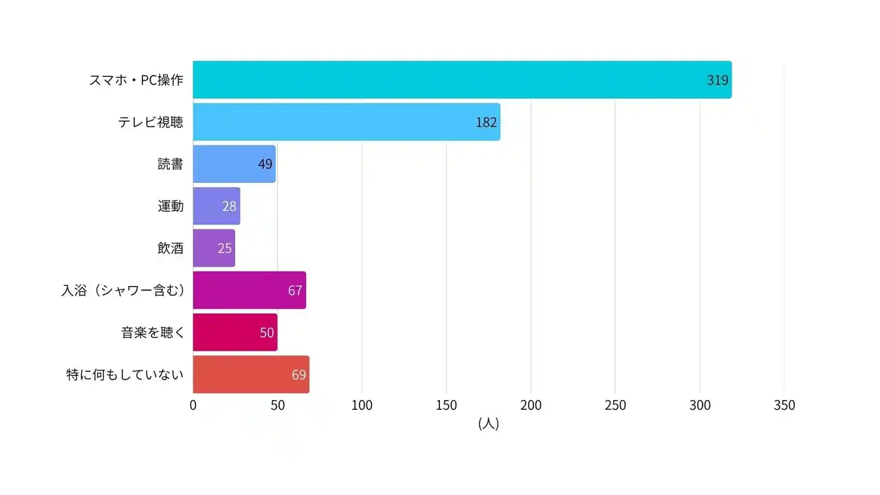 就寝前1時間以内に行う習慣については、63.8%が「スマホ・PC操作」と回答し、圧倒的に多い結果となりました。次いで「テレビ視聴」(36.4%)、「特に何もしていない」(13.8%)が挙がりました。 |
