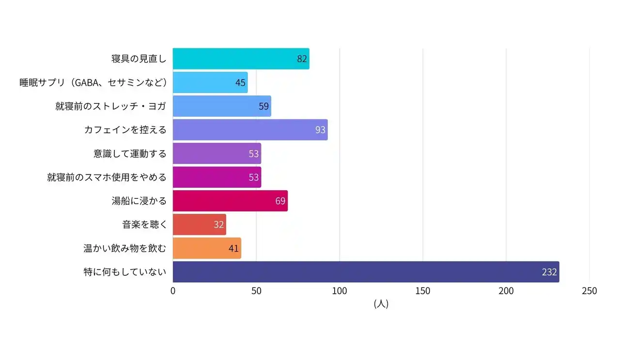 一方で、具体的な取り組みとして「カフェインを控える」(18.6%)、「寝具の見直し」(16.4%)、「就寝前のストレッチ・ヨガ」(11.8%)、「睡眠サプリの利用」(9.0%)といった工夫も見られましたが、いずれも2割未満にとどまりました。 |