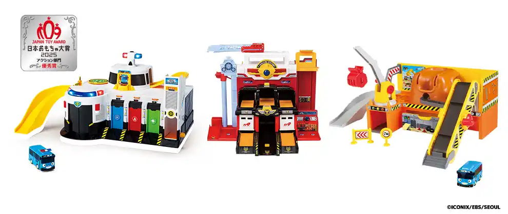 ミニカーと一緒に遊べる『ちびっこバス タヨ 緊急出動センタープレイセット』(12,650円・税10%込/11,500円・税抜)は、「日本おもちゃ大賞2025アクション部門」の優秀賞を受賞しました。劇中同様の音声や発光するパトランプに加えて、滑り台やリフト、ボタンを押すと一斉にミニカーが飛び出す車庫など、アニメの世界を再現できる様々なギミックを搭載しています。