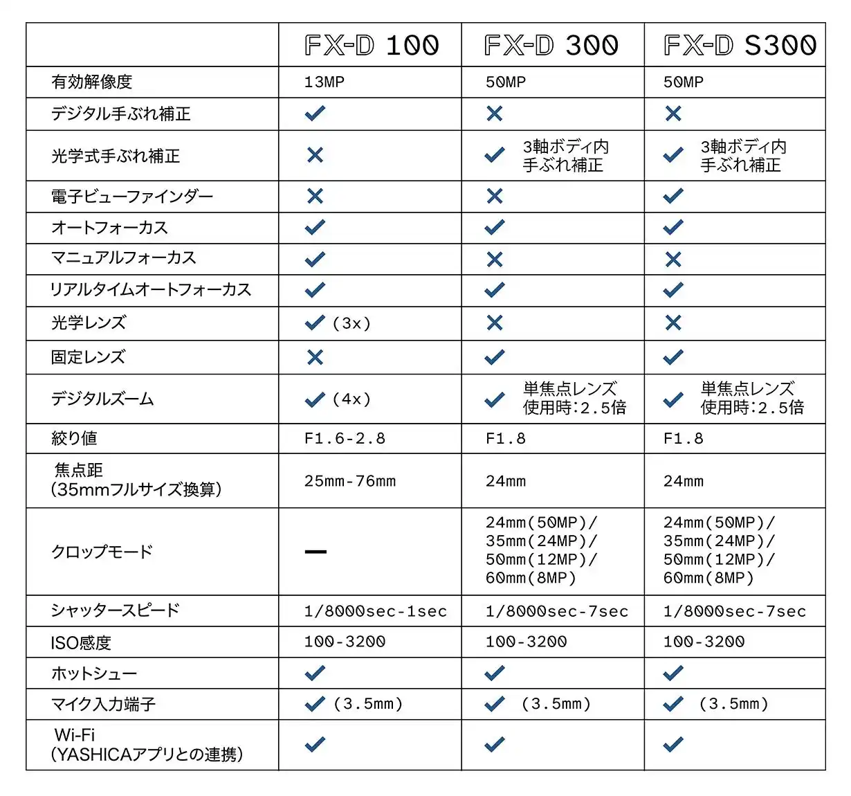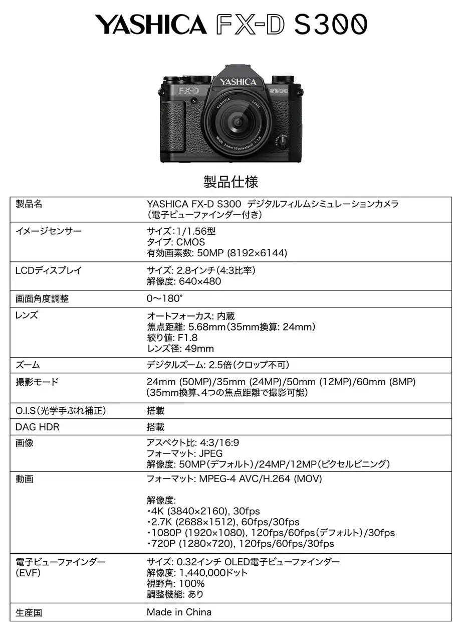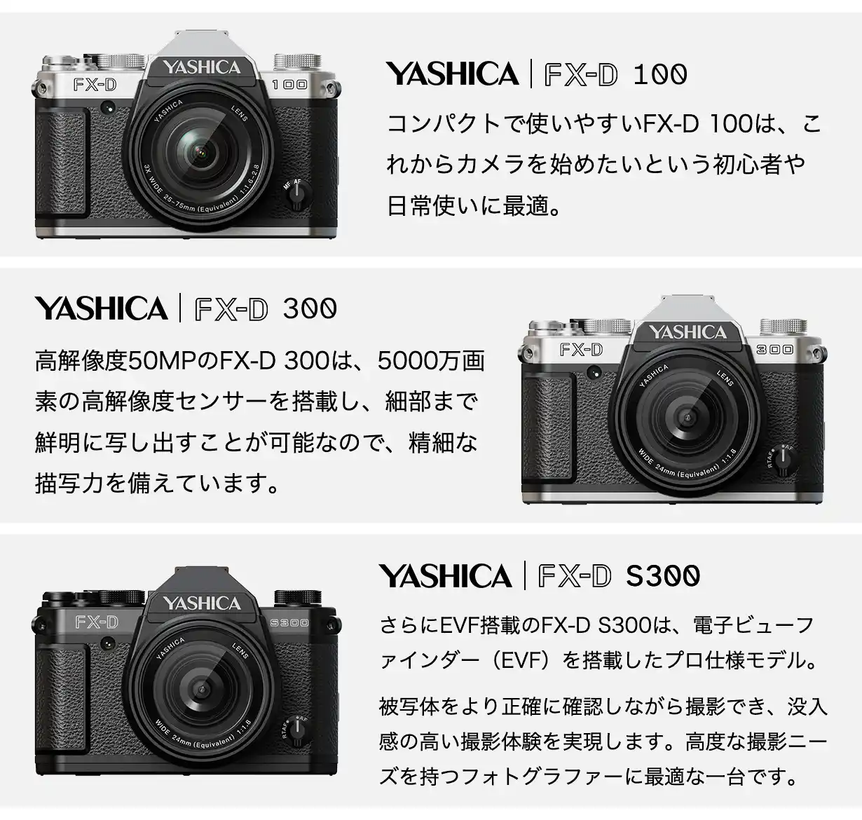 YASHICA FX-D S300:FX-D 300の機能に加え、EVF(電子ビューファインダー)を搭載。没入感ある撮影体験を実現。精悍なオールブラック仕様。 |