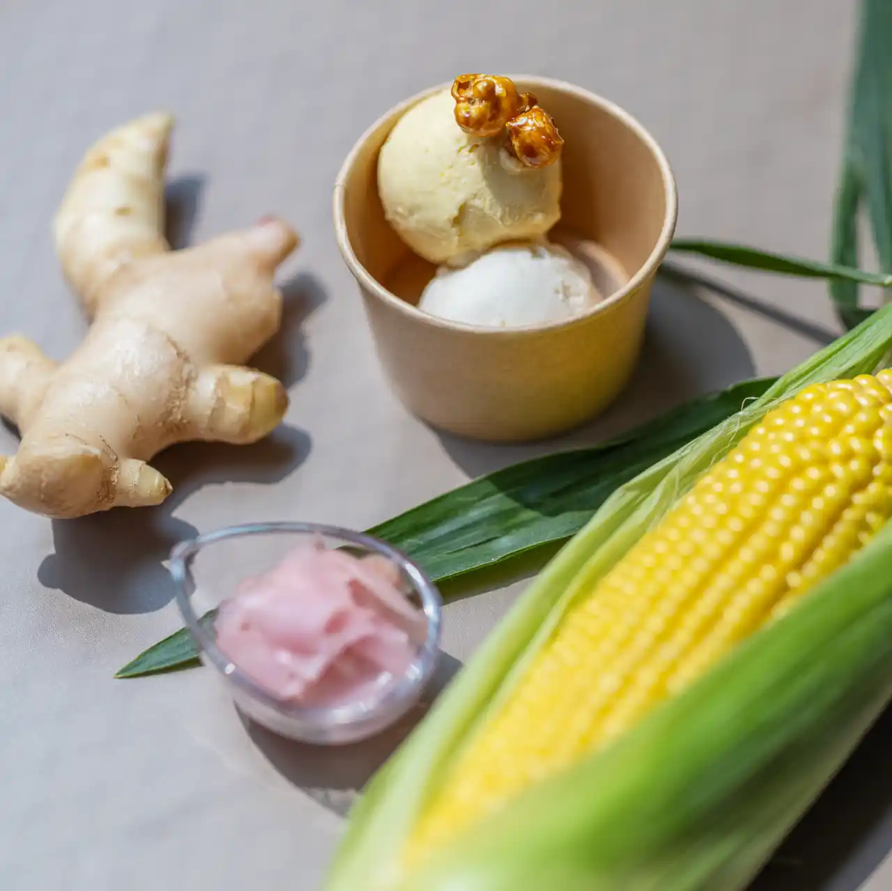 新潟県産の旬の果物や野菜とハーブ、スパイス、お茶といった食材をかけあわされたプラントベースのアイスクリームブランド。地元の農家よりB級品食材を仕入れ、フードロス削減にも取り組んでいます |