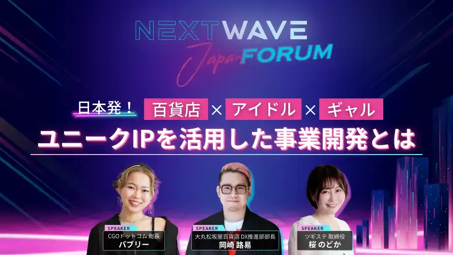 | 株式会社大丸松坂屋百貨店(本社:東京都江東区、代表取締役社長:宗森 耕二、以下、大丸松坂屋百貨店)、株式会社ツギステ(本社:東京都渋谷区、代表取締役社長:橋本 ゆき、以下、ツギステ)、合同会社CGOドットコム(本社:東京都渋谷区、代表:総長 バブリー(竹野 理香子)、以下、CGOドットコム)は、2025年9月19日(金)渋谷QWS CROSS PARKにて「NextWave Japan Forum~インフルエンサー・メタバース・アイドル・ギャルで創る 次世代マーケティングを考える~」を開催します。 | |||