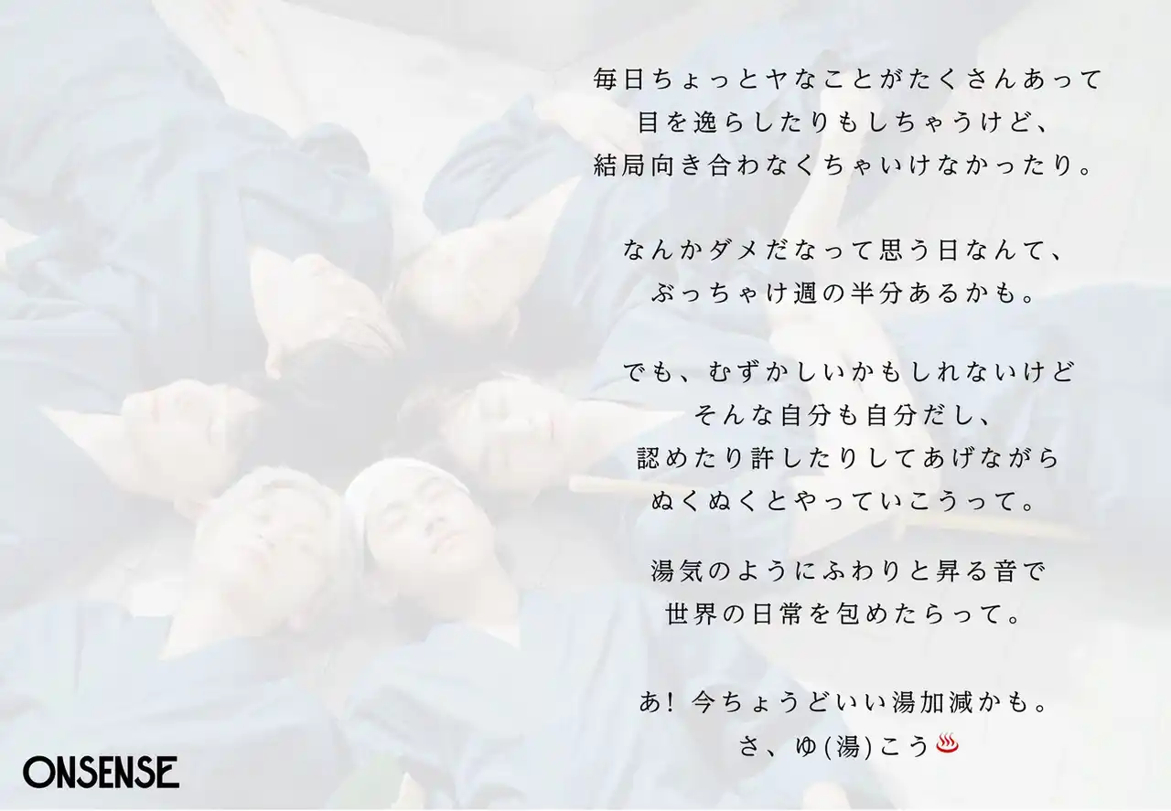 『ONSENSE』とは、日本のトラディショナルな要素である「温泉(ONSEN)」に、「センス(SENSE)」を組み合わせた造語。メンバーは「湯気のようにふわりと昇る音楽やテーマで 世界の日常を包めたら」という思いのもと、等身大の自分や日々の感情を表現。 |
