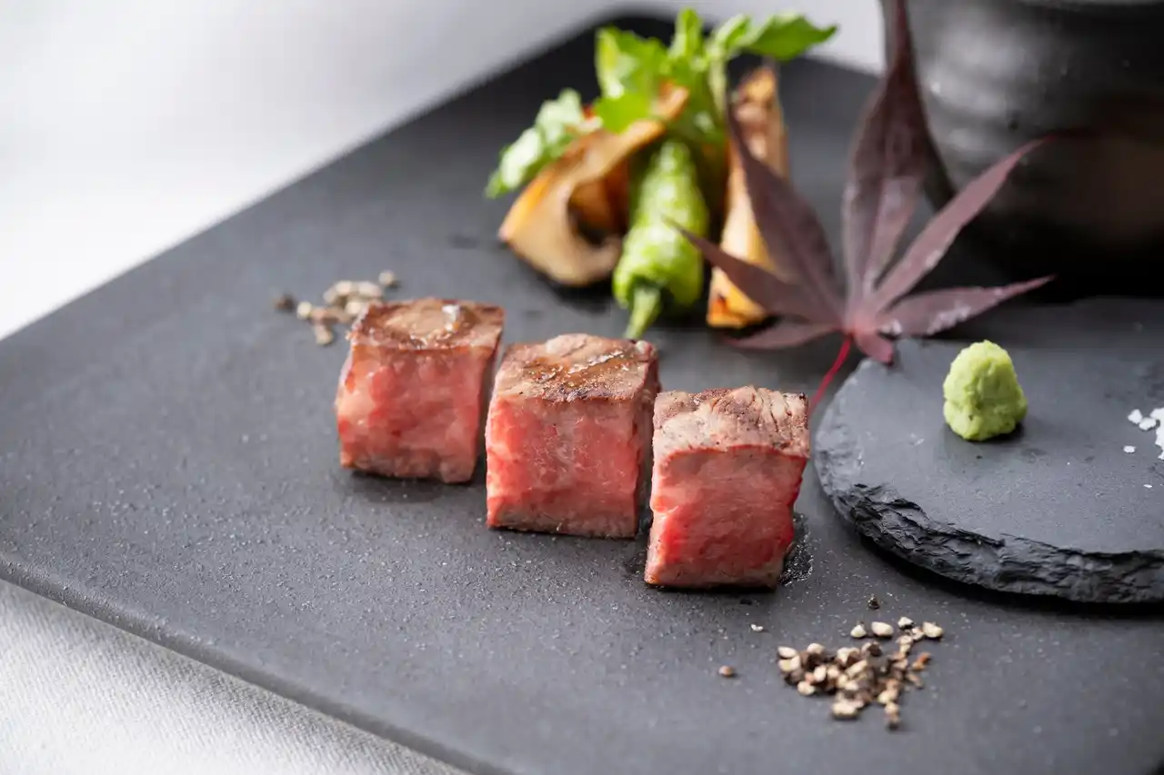 国産牛ロース肉のグリルと彩り野菜 山葵、胡椒、ゲランドの塩 |