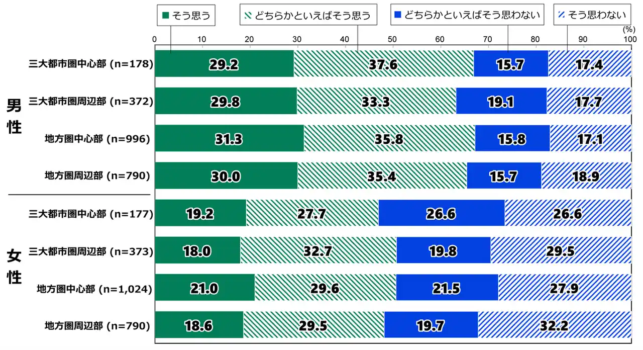 まずジェンダー・結婚・子育て観。少子化の関連でも注目される「結婚して子どもを育てる人生が望ましい」との考えについて、4地域とも男性の約3分の2が「どちらかといえば」も含め「そう思う」と答えているのに対し、女性は「そう思わない」が同様に「どちらかといえば」を含めると4地域とも過半数を占め、男女間の違いが浮き彫りにされています。「子どもが生まれたら主に女性が育児を担うことが望ましい」に関しても同様に地域差は少ないものの、「そう思う」の回答は男性が7~11%、女性が2~4%とかなりの開きが出ています。 |