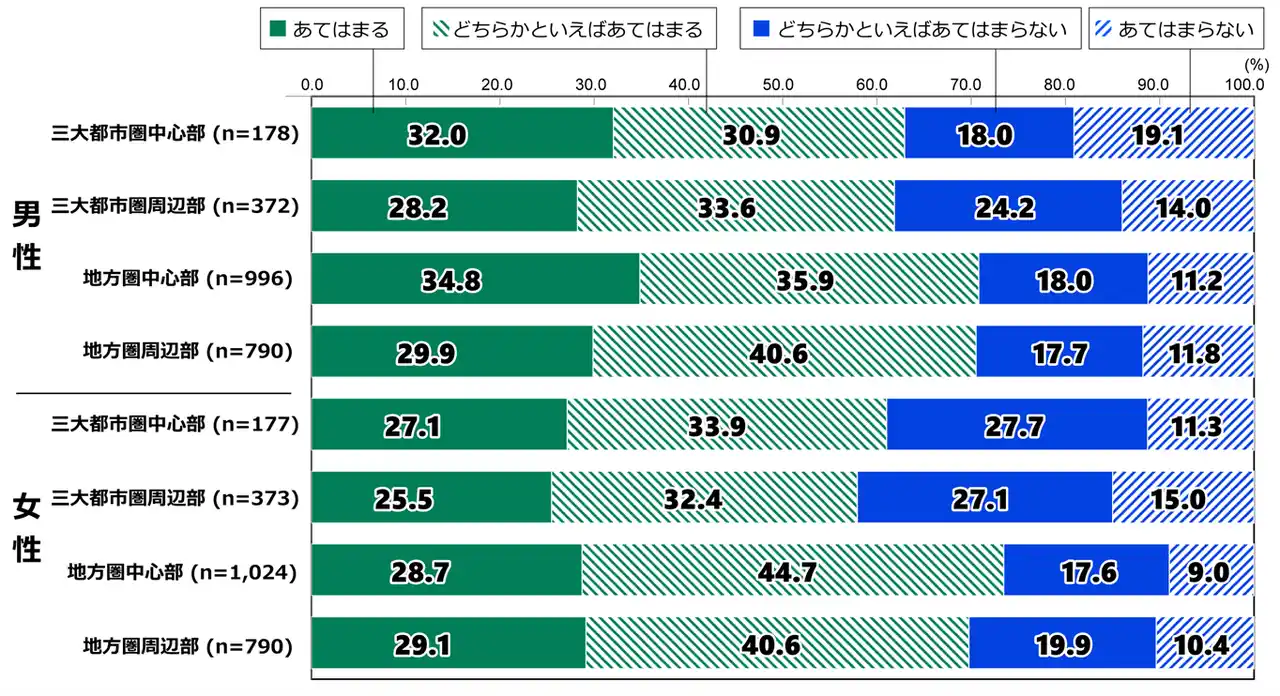 社会との関わりに関し「住むまちに誇れる伝統・文化・歴史がある」と認識する人は男女とも三大都市圏より地方の中心部、周辺部が高い数字となっています。このほか長期休暇で行きたい都道府県の1位は「北海道」が33都府県と圧倒的に多く、次いで「東京都」が14道県。同様に長期休暇でしたいことでは「勉強・自己研鑽」が26都道府県、「アルバイト」が13府県でトップ、開会中の大阪・関西万博に「ぜひ行きたい」は「どちらかといえば」も含め22都府県で60%を超えています。 |