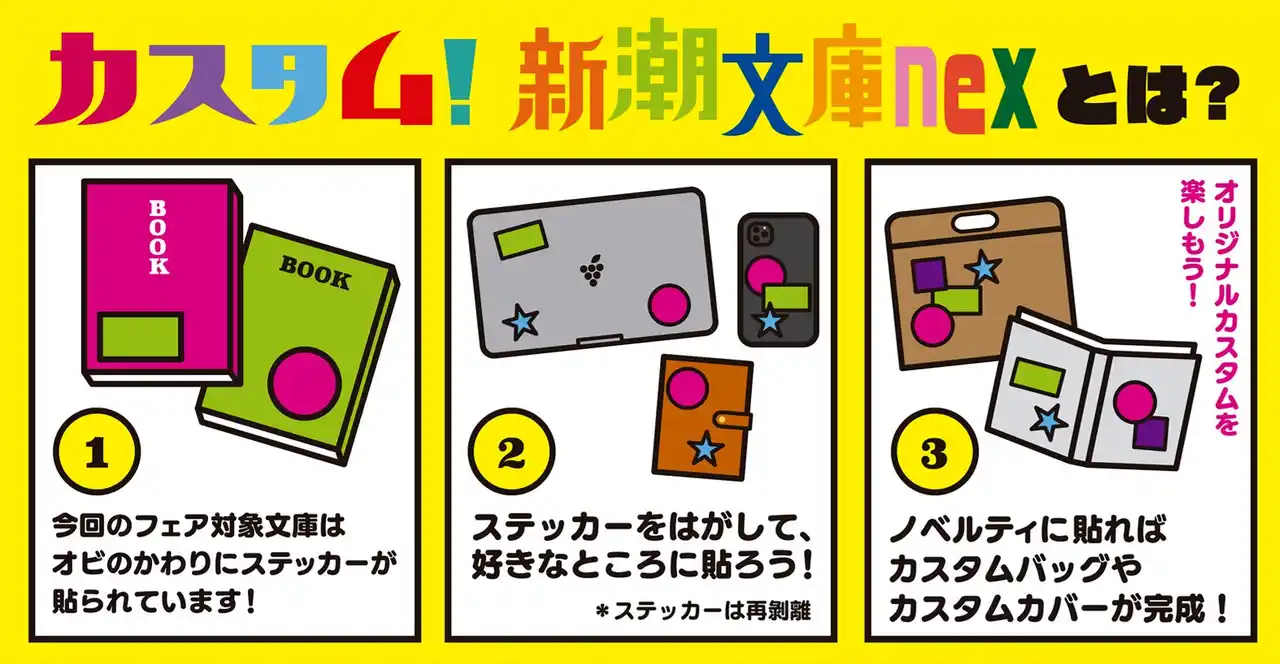 2025年9月から全国の書店で「新潮文庫nex11周年フェア」がはじまります。今年は「ステッカーをあつめて貼ろう!」が合い言葉の「カスタム!新潮文庫nexフェア」です。