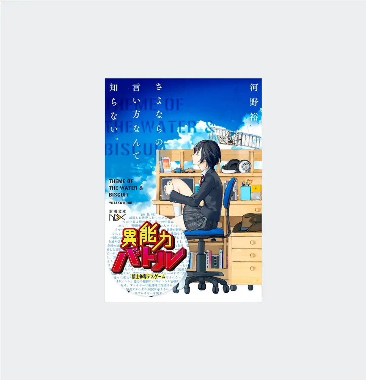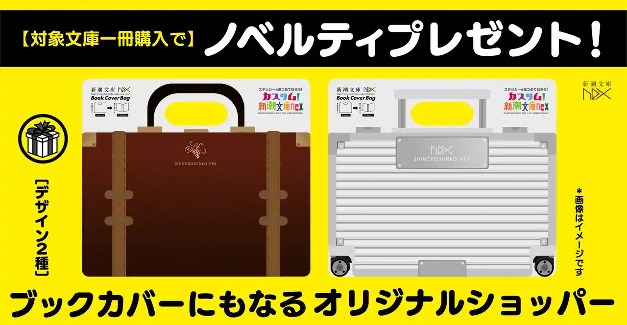 | チケットの半券、入場パス、記念スタンプ……ワクワクする体験の記念をスーツケースやスマホケースに貼って「カスタム」するのは、とても楽しいですよね。面白い小説と出会えた喜び、充実した読書体験の余韻も、旅の記念と同じように楽しくカスタムして残せたら……と考えました。11周年を迎えた新潮文庫nexフェアは「ブックカバーになるショッパー」を購入者全員にプレゼント! さらに、12タイトルに、オビの代わりに、はがして何度でも貼れる「カスタムステッカー」を付けました。読み終わったらステッカーを文庫からはがして、自分だけのカスタムが楽しめます。新潮文庫nexをたくさん読んで、ステッカーをあつめて、あなただけの読書の記念に、オリジナルなカスタムブックカバーを作って楽しんでください。 | |||||||||||||||||||