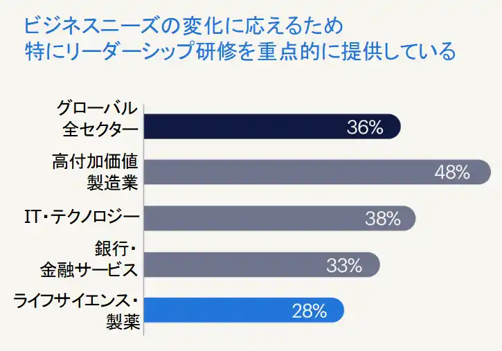 ライフサイエンス・製薬業界はスキル・ファーストモデルへの移行を積極的に進めており、リーダーの82%がすでに移行済み、または移行中であると回答しています。これは急速な技術革新に対応するために、職務経験よりも潜在能力を重視する姿勢を反映しています。このように、人事部門はスキル・ベースの考え方を取り入れているものの、現場の管理職は特定の職務や役割に固執している傾向が見られ、このギャップは世界平均を13ポイント上回る43%に達しています。さらにビジネスニーズの変化に対応するためのリーダーシップ研修を重点的に提供している企業はわずか28%に留まり、これは世界平均の36%を下回る最も低い数値です。 |